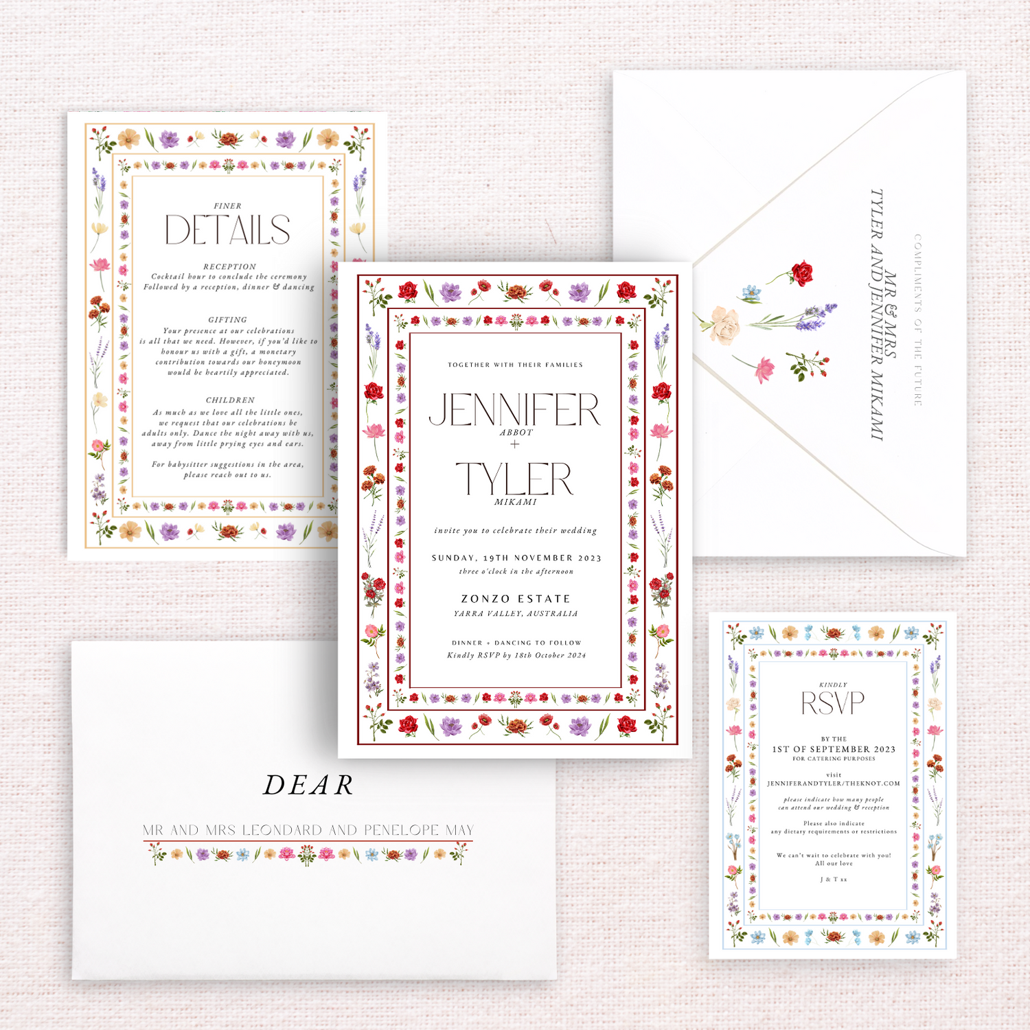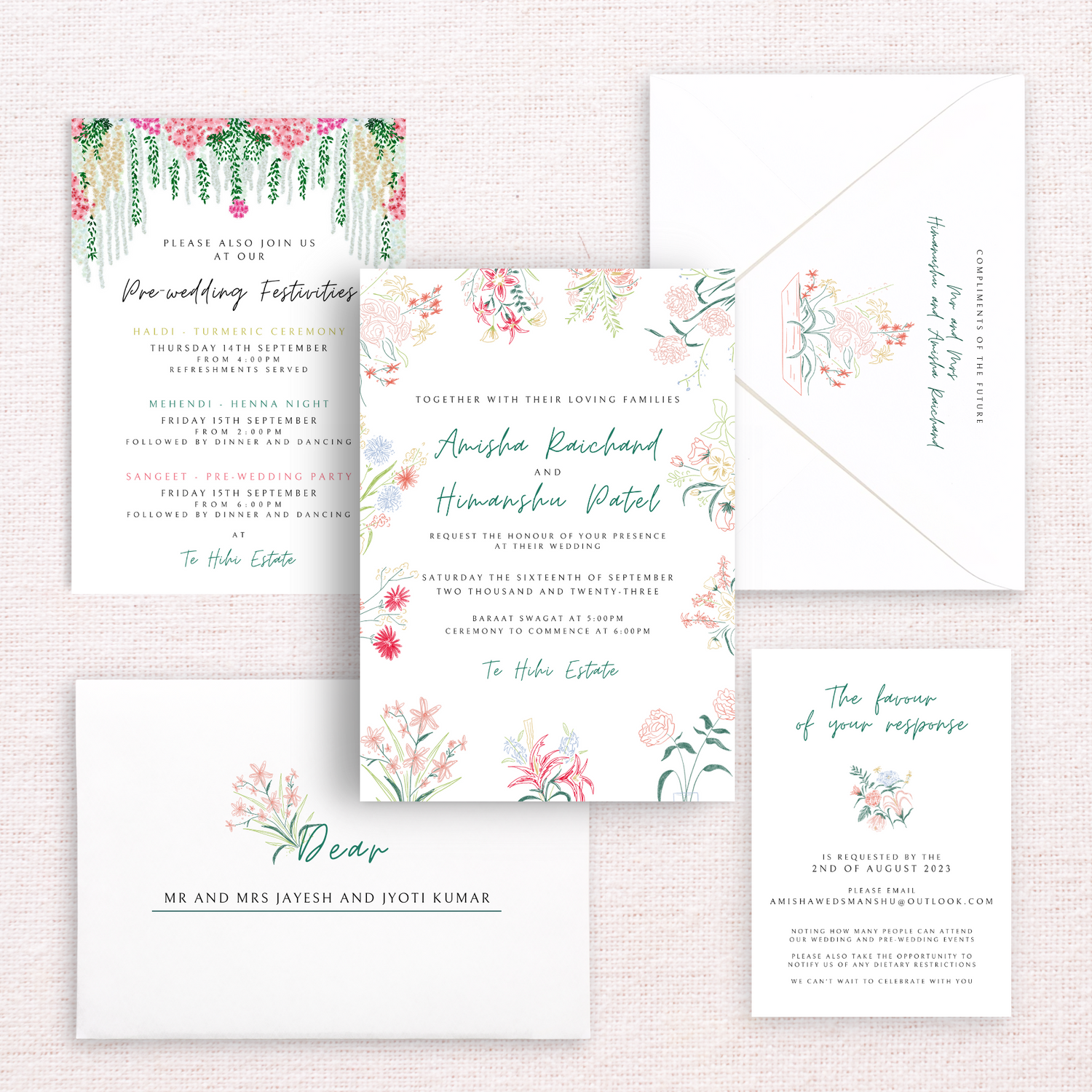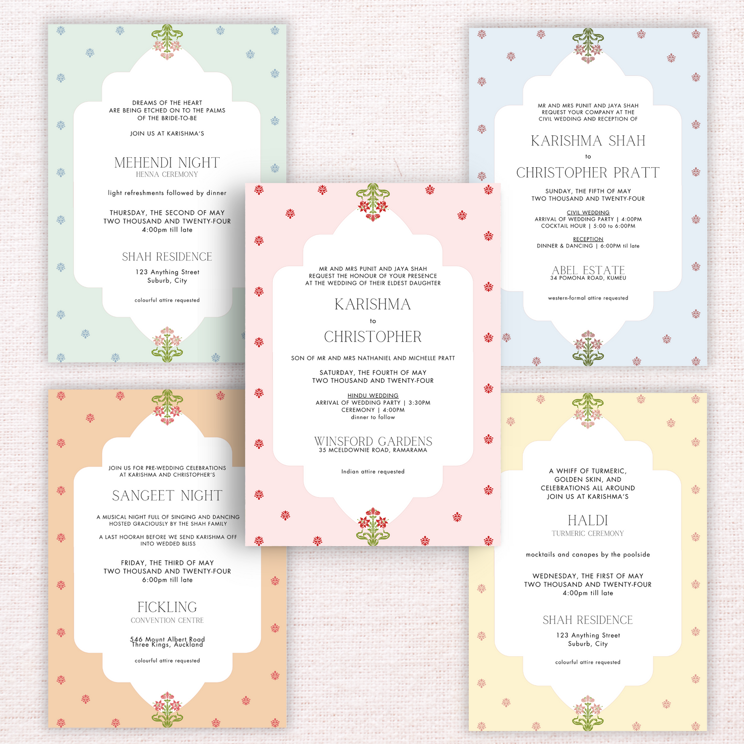 soft PASTELS AND DAINTY FLORALS, PERFECT FOR A MULTI-EVENT FUN FUSION WEDDING WEEK. MAKE THIS YOURS BY CUSTOMISING THE COLOUR PALLETTE OF EACH CARD.