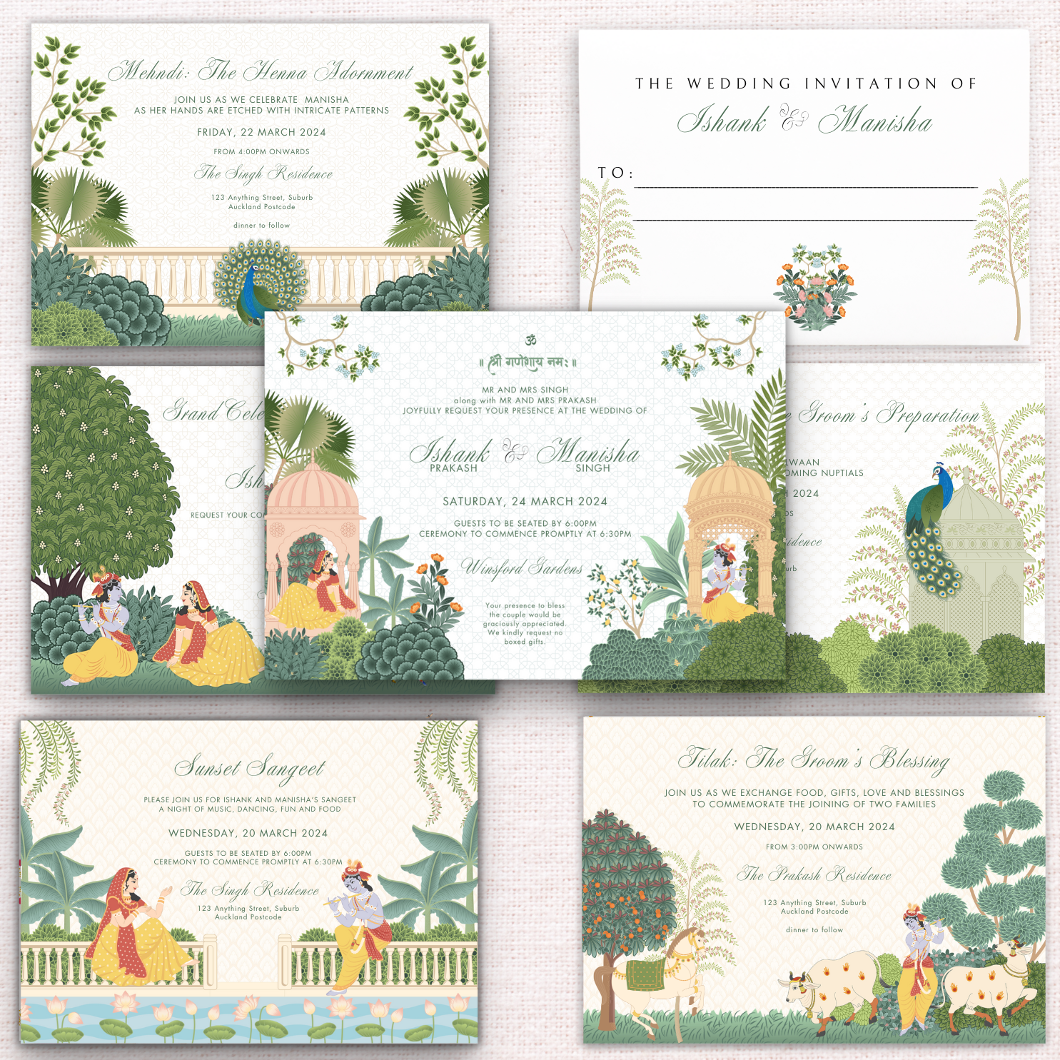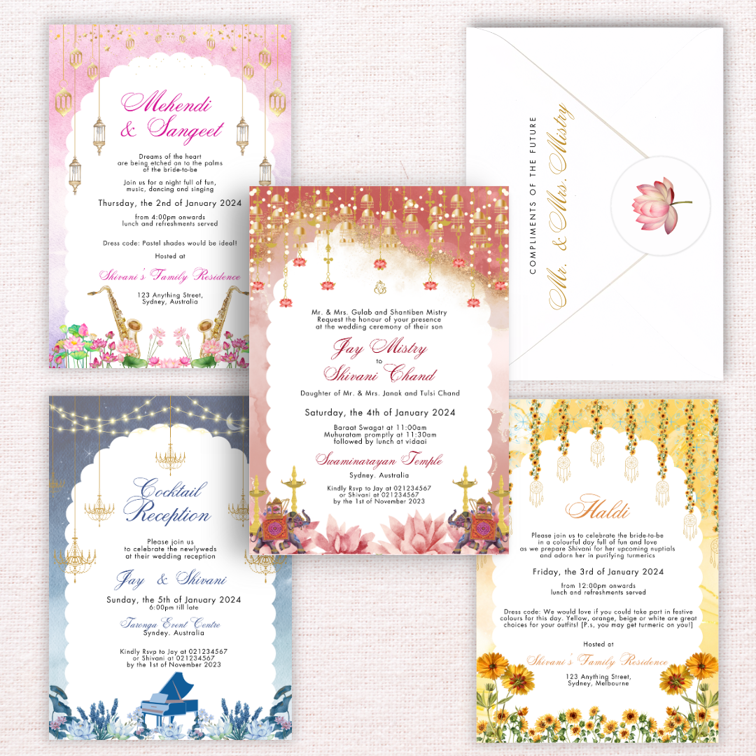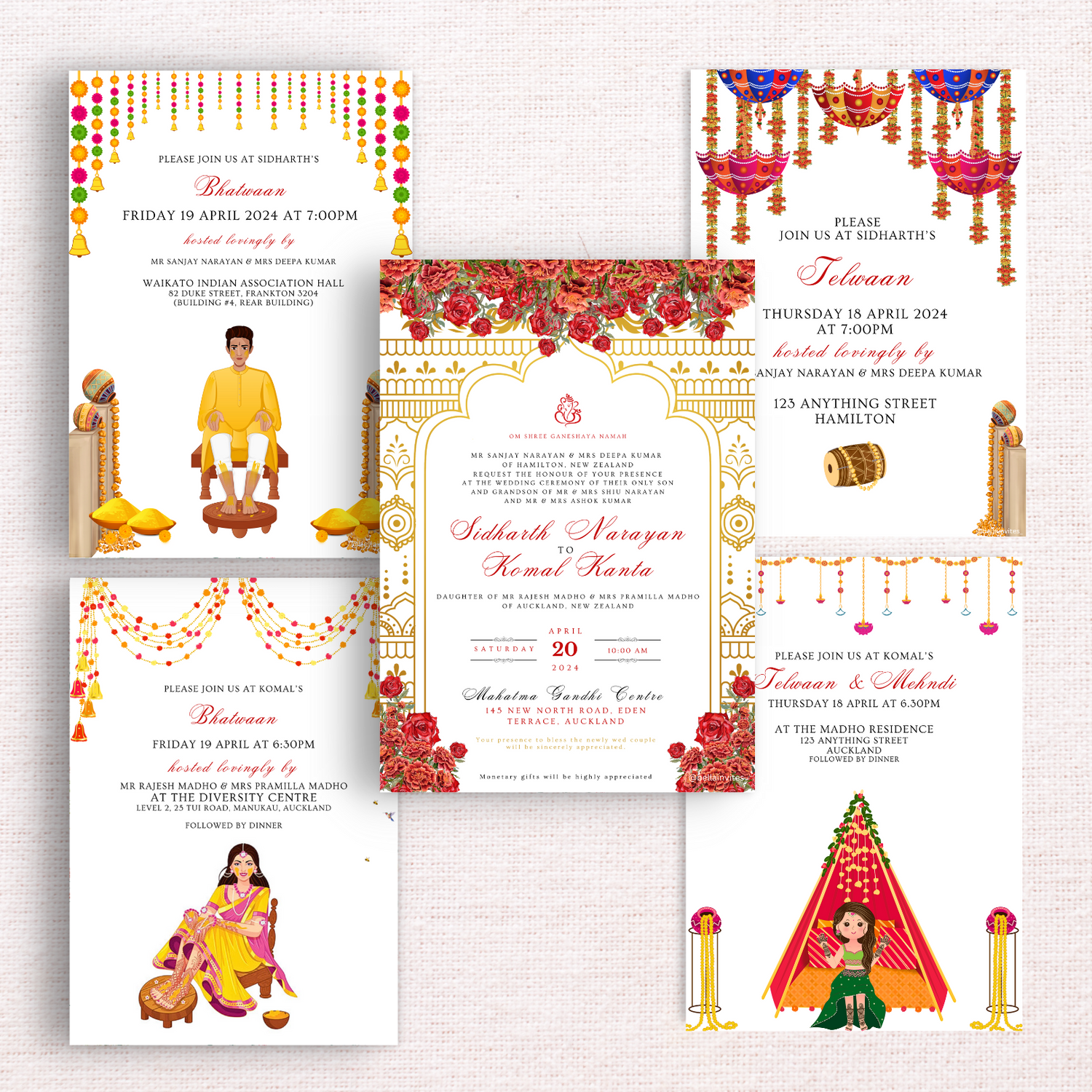 fun caricatures and symbols, designated colours to represent each event/card for a multi-day south-asian wedding