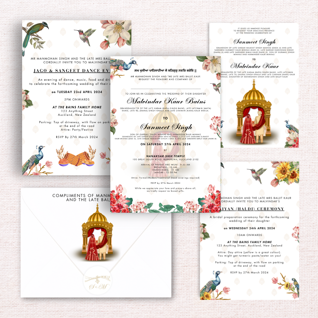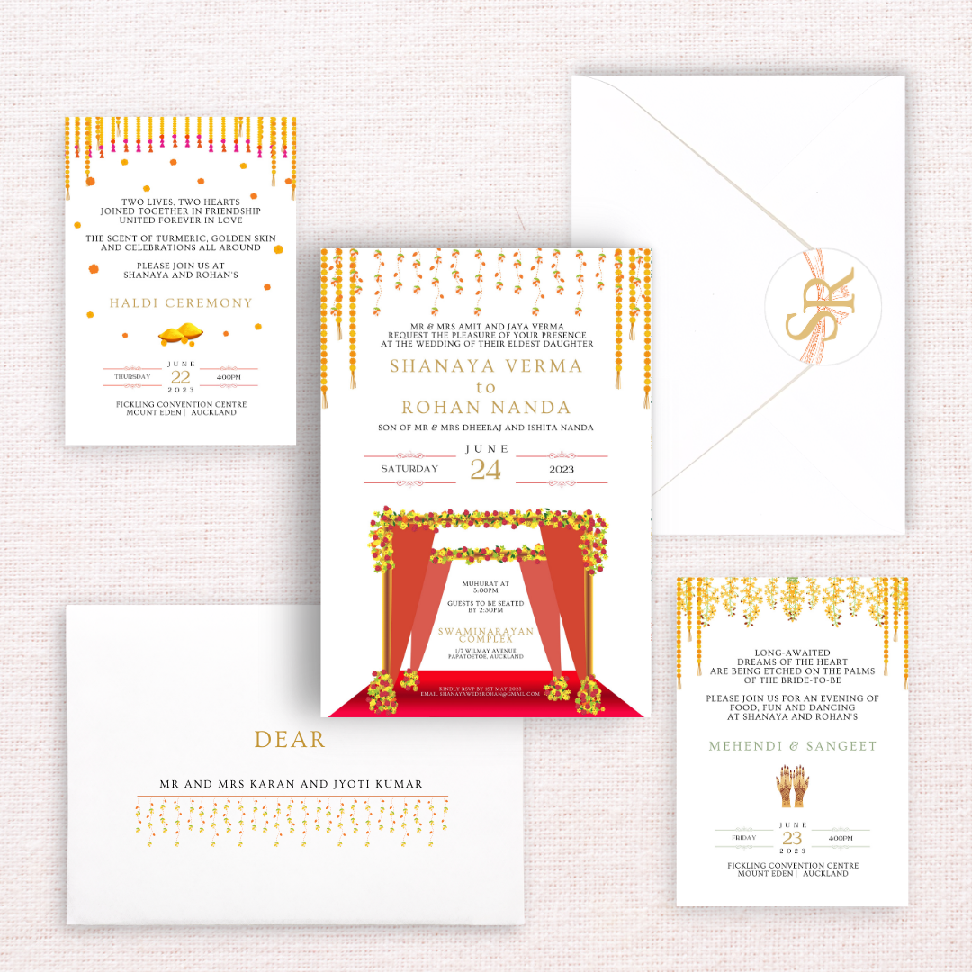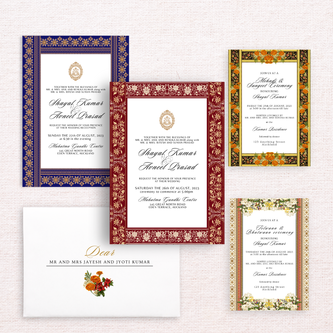 fun caricatures and symbols, designated colours to represent each event/card for a multi-day south-asian wedding