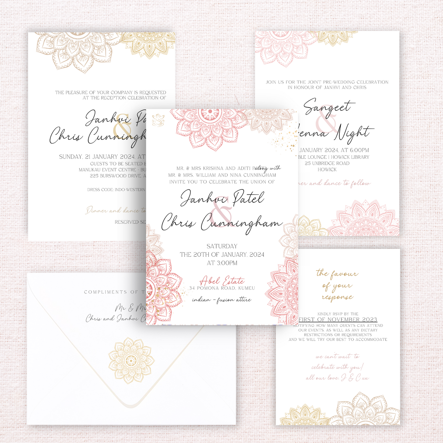Mandala inspired wedding invitation, perfect for Indo-Western (or fusion, multicultural) weddings. Classic invitations with a touch of Indian patterns. All colours can be changed